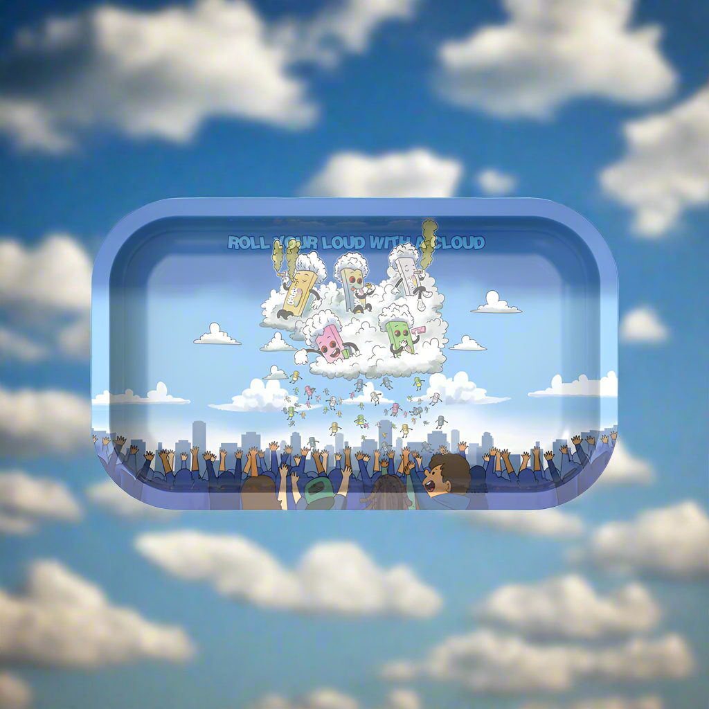 Elevate your smoke sessions with the Cloudz "The Sky" Rolling Tray! This vibrant and brand-new piece features the iconic Cloudz Gang in full swing, showering the stoner crowd below with premium Cloudz Papers. Each of the five unique characters brings their distinct energy to the scene, set against a dynamic, colourful background that turns this tray into a work of art.